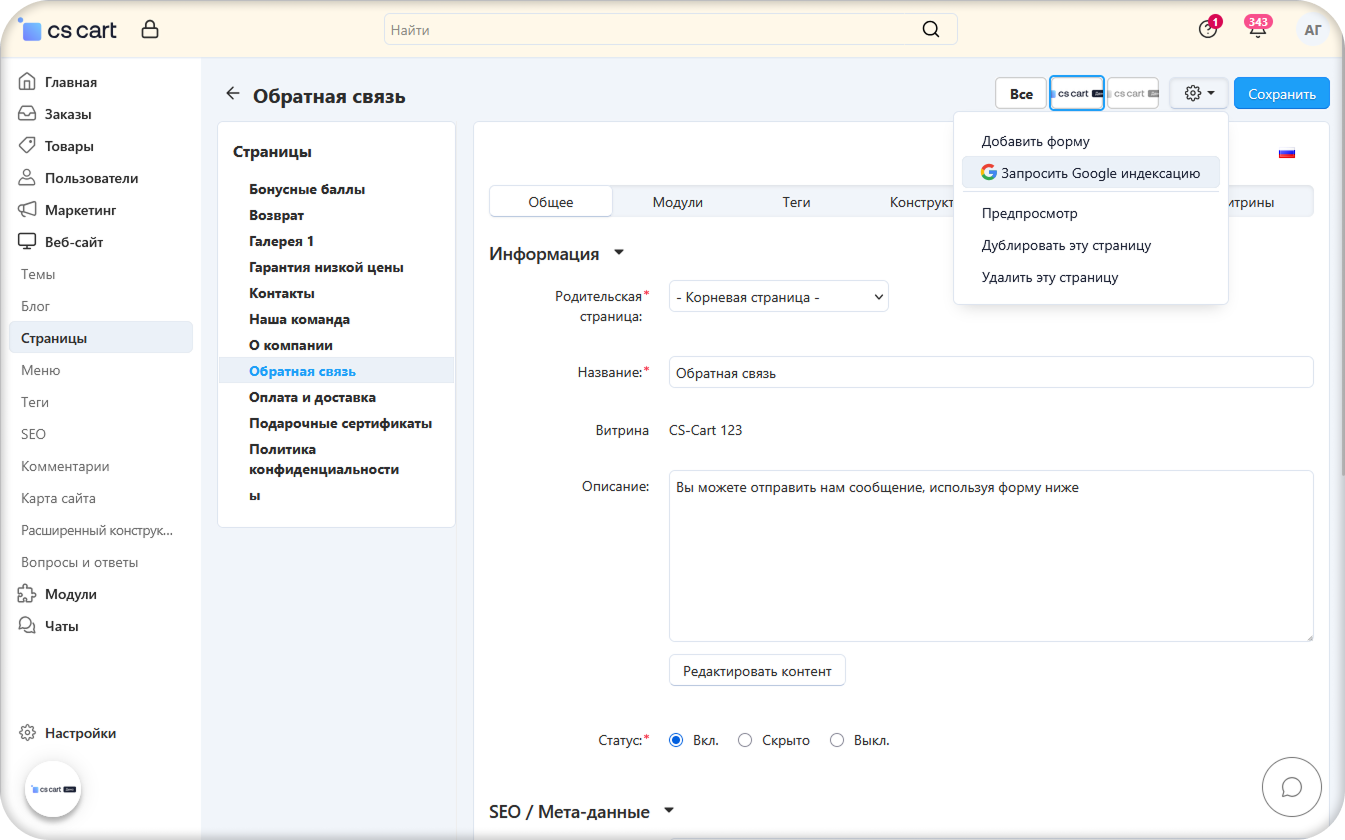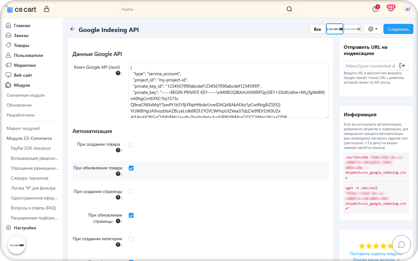 С помощью данного модуля можно автоматизировать процесс отправки на индексацию новых страниц, товаров, категорий, а так же отправлять их в ручном режиме прямо из админки в один клик! Забудьте про медленный google search console и получайте удовольствие от работы модуля Индексации Google API. Модуль очень просто в настройке и использовании. Но требуется единоразовая настройка в Google Search Console и Google Cloud Services. Инструкцию по настройке смотрите в документации к модулю.
